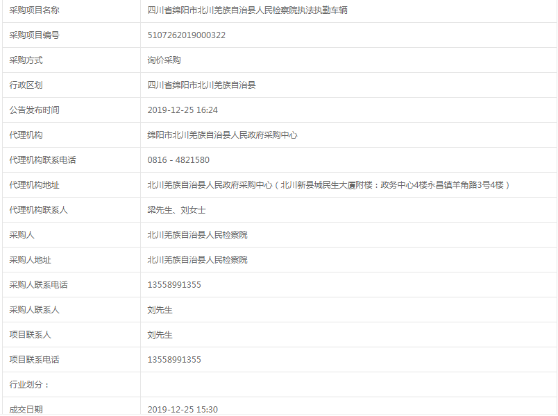 四川省绵阳市北川羌族自治县人民检察院执法执勤车辆询价成交公告